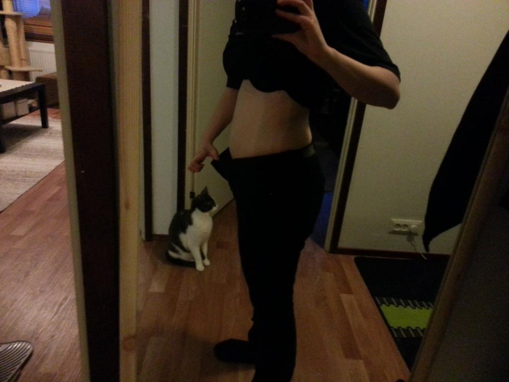 Olen aiemmin kirjoittanut, että en ole ottanut lähtökuvia alkutilanteesta. Ajattelin kuitenkin ottaa nyt tämänhetkisestä tilanteesta kuvan. Olen kuvassa sellaiset housut päällä, jotka eivät tammikuussa projektia aloitettaessa mahtuneet jalkaan, vaan jumahtivat reisien kohdalle. Nyt kuusi kiloa laihempana nuo housut roikkuvat jalassa. Saattaa kuulostaa noin pienen pudotuksen jälkeen oudolta, mutta niin se vai on. Ja nuo housut eivät ole siis venyneet käytössä, vaan ovat ihan jykevää farkkukangasta. Mutta niin, tässä se kuva: